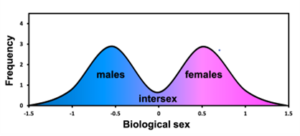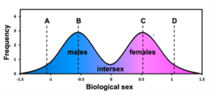 Because biology is complex, people can be easily swayed with graphs and drawings, especially if they purport to prove something we want to believe anyway—such as the supposedly liberating notion that sex is a spectrum instead of a binary. But a spectrum implies a quantitative axis and, when this is taken seriously, leads to troubling conclusions. One particularly popular graphical depiction presents sex as bimodal—meaning that there are two maxima representing “male-ness” and “female-ness,” around which most people tend to cluster. A viral tweet by Twitter user @ScienceVet2, now with over 17,000 retweets, conveyed the bimodal sex spectrum model using a figure similar to the one below.
